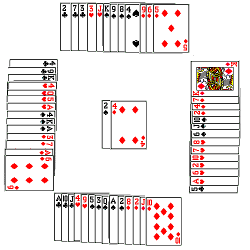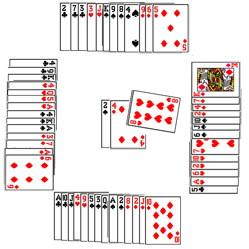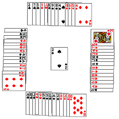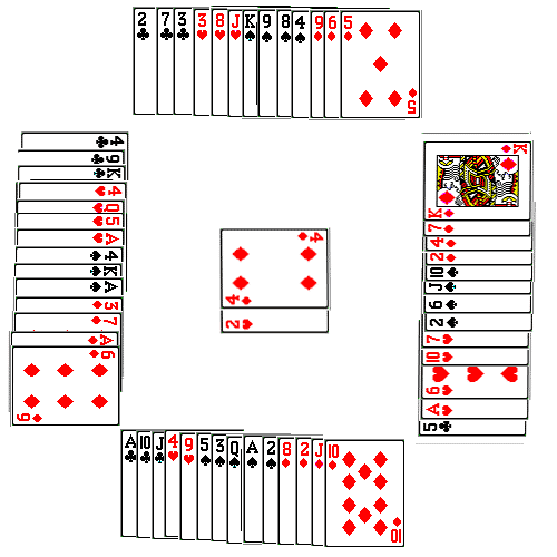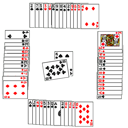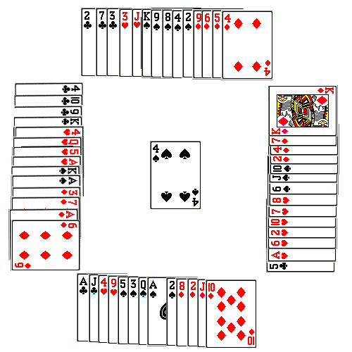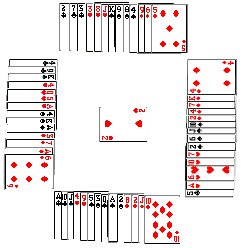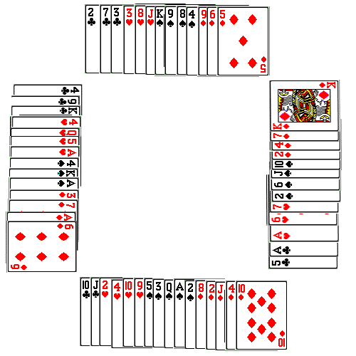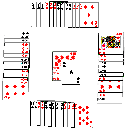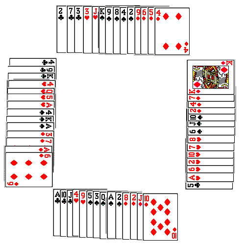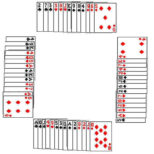 The role of buyer then rotates clockwise to the next player.  The game ends when the opportunity to be a buyer has gone twice around the table.  The players then calculate their scores by summing the value of each of their cards.  For example, if a player has four cards in each of two suits and three cards in each of two suits, the total value of the hand is 255 + 255 + 245 + 245 = 1,000.  If several games are played, the role of dealer rotates clockwise around the table.  The overall winner in each group is the player with the highest average score.