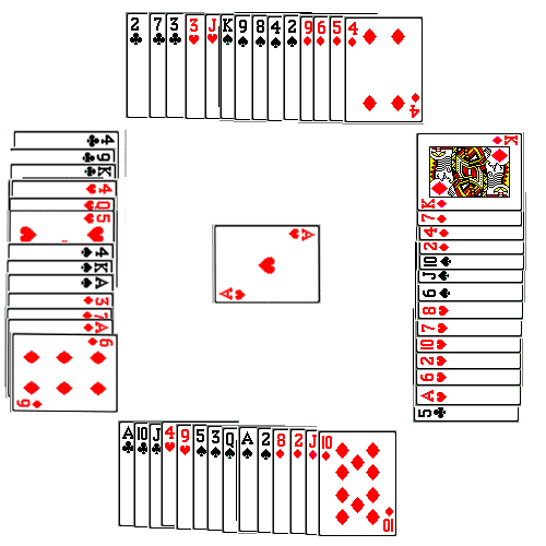 Divide the class into small groups of 4, 5, or 6 students and have each group form a circle around a playing surface, like a table, the floor, or desks joined together.  (Note:  The 4-player game is more strategic and difficult.  Beginners usually do better in groups of five or six.)  Make sure that each student is within arm’s reach of the middle of the playing surface.  Give each student a copy of the scoring sheet (pdf format), and each group two decks of standard playing cards.