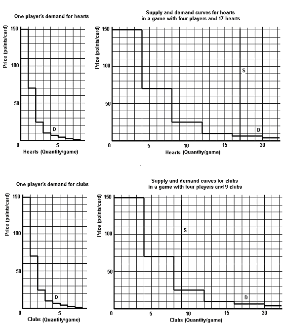 Strategy:  Pay attention to what cards your opponents are bidding, accepting, and rejecting.  If you want to sell a club, for example, and you suspect that the other players don’t have very many, then you may be able to get two or more cards for it.  Teaching points:   Since the marginal benefit schedule for cards in each of the suits is identical, the demand for cards in each suit is the same.  This is because the marginal benefit curve for any individual is identical to that person’s demand curve, and the market demand curve is simply the horizontal sum of all of the individual demand curves in the market.  What changes from game to game is the total supply of cards in each suit.  Suppose that 17 hearts are dealt, but only 9 clubs, as shown in this figure.   According to the supply and demand model, the equilibrium price of hearts will be lower than that of clubs.  Astute players try to deduce whether cards in any suit are relatively scarce or abundant so that they can make more advantageous trades.