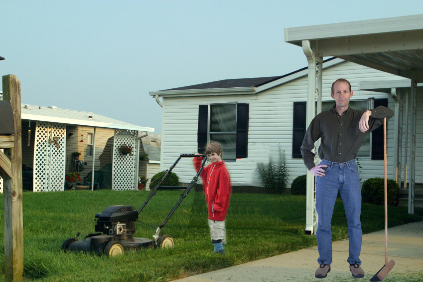 Concept:  comparative advantage, absolute advantage  What's wrong with this picture?    The man and the boy would probably get done more quickly if they switched chores.  This isn't because the father can mow the lawn faster, since it's likely that he can mow AND sweep faster (i.e., he has an absolute advantage in both chores).  They should switch since the boy likely has a comparative advantage in sweeping the driveway, while the man has one in mowing the lawn.  (Note:  Click on the picture to download a high resolution version of the image.)