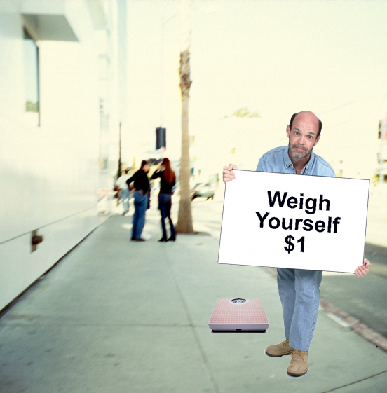 Concepts:  opportunity cost, substitutes, demand  What's wrong with this picture?   People offer this service in less developed countries, but they don't in richer countries.  Most Americans have scales at home (a substitute for public scales), so the demand for this service is small.  It's unlikely that this man would get enough customers to cover the opportunity cost of his time.  (Note:  Click on the picture to download a high resolution version of the image.)